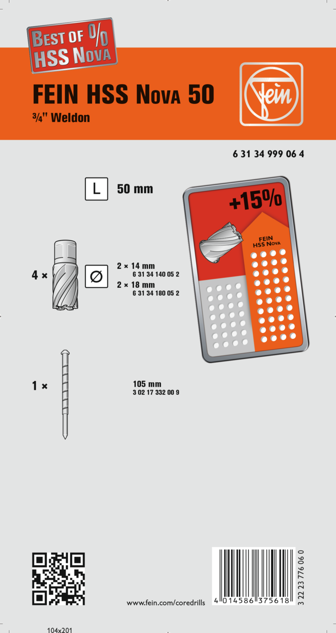 Set modeli, plastik çanta içerisinde 4 adet Ø 2 x 14 mm, 2 x 18 mm (kesme derinliği 50 mm) karot matkabından ve 1 merkezleme piminden (100 mm) oluşur.