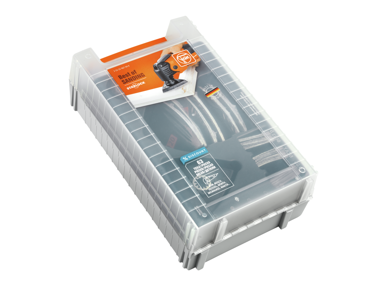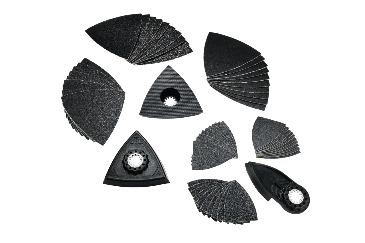 63 parçalı aksesuar seti, köşelerde ve kenarlarda zımparalama için. Tüm FEIN çok fonksiyonlu aletlere ve piyasada yaygın olarak bulunan Starlock yuvalı diğer tüm çok fonksiyonlu aletlere uygundur. Tek tek satın almaya göre cazip fiyat avantajlı set halinde. İçerik: 2 zımpara tabanı, deliksiz (80 mm), 1 zımpara parmağı, zımpara tabanı ve zımpara parmağı için 10’ar adet zımpara kağıdı (K 60, 80, 120).