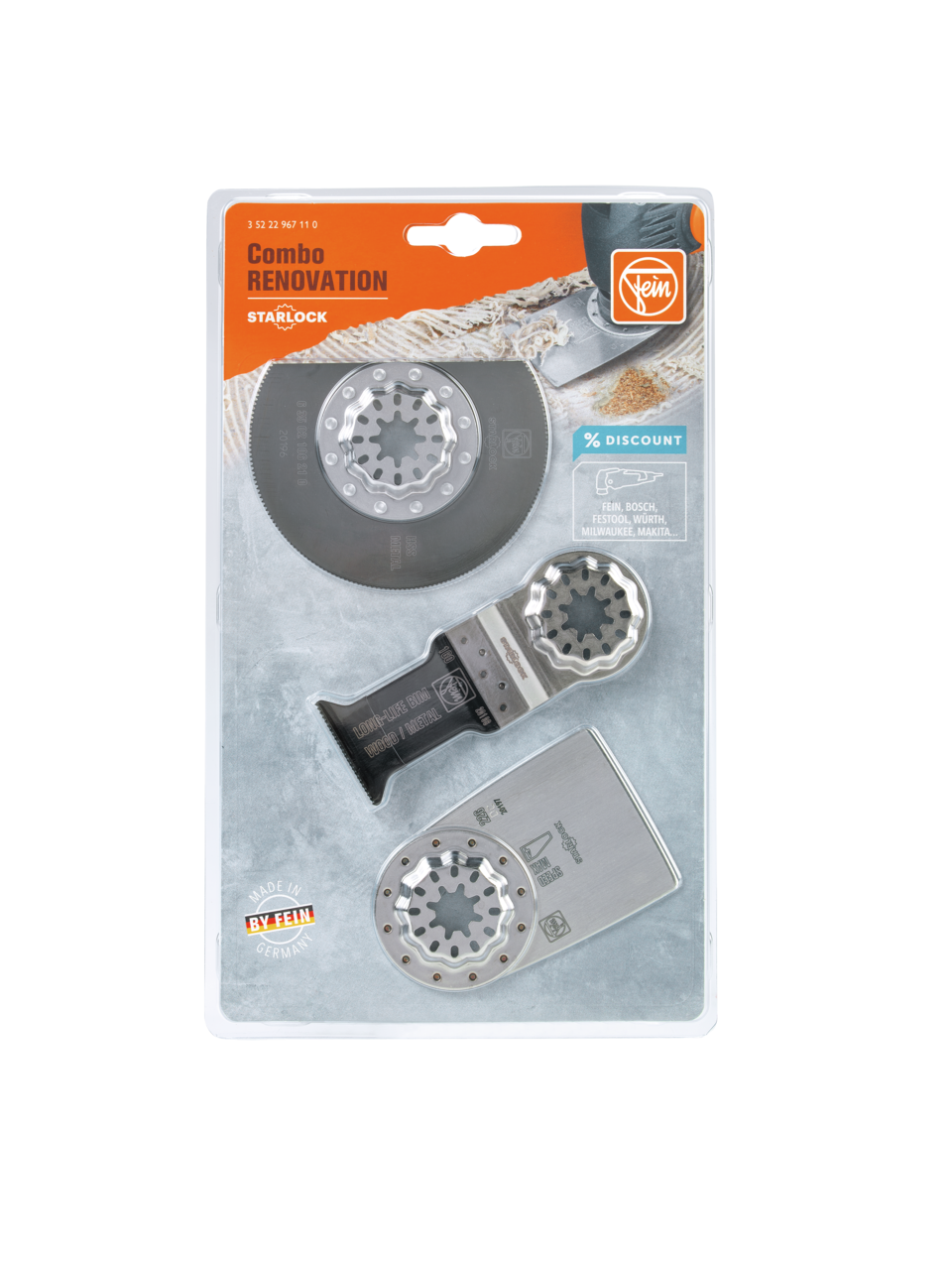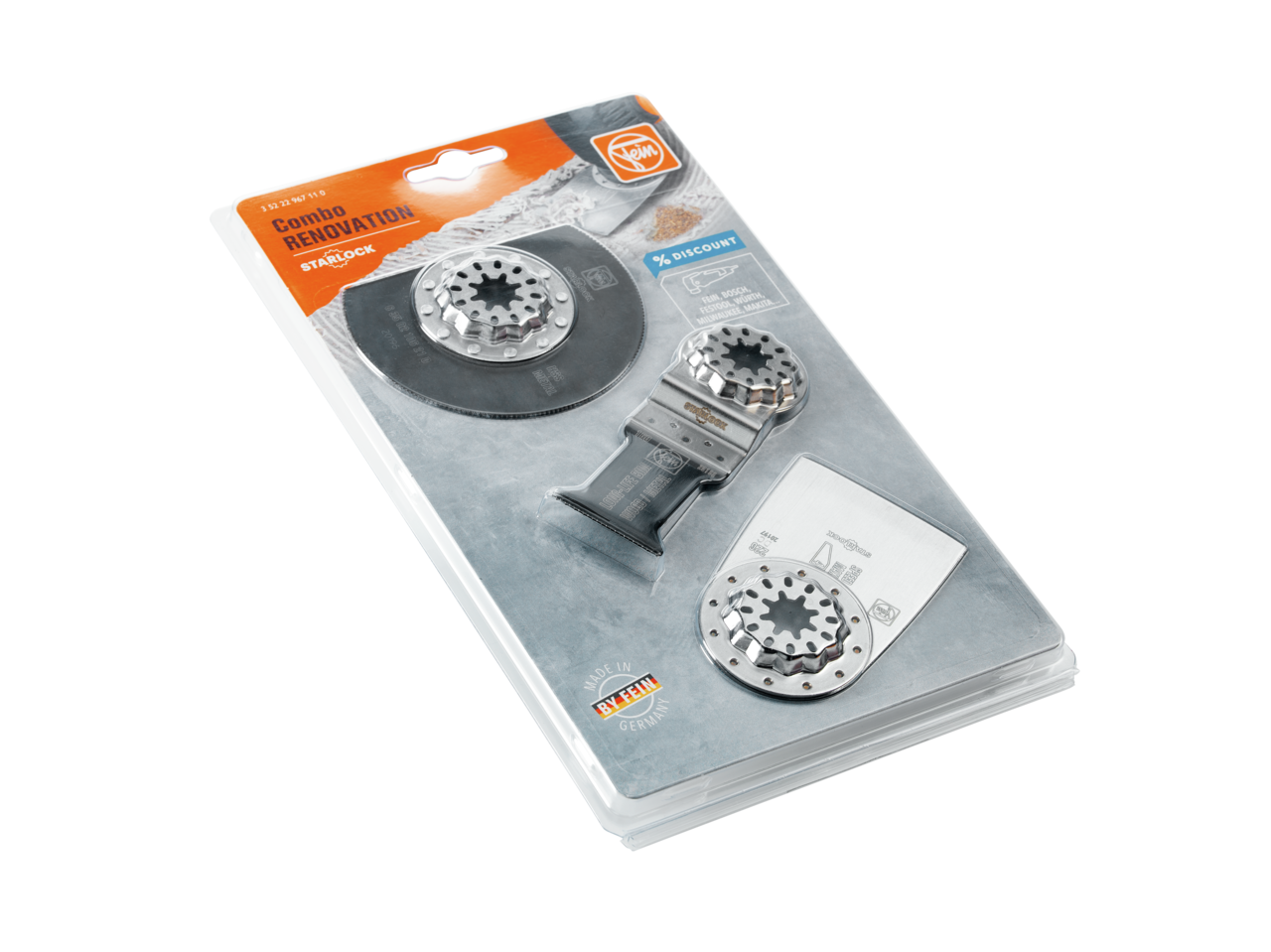3 aksesuar, zeminde yapılan yenileme işlerine özel. Tüm FEIN çok fonksiyonlu aletlere ve piyasada yaygın olarak bulunan Starlock yuvalı diğer tüm çok fonksiyonlu aletlere uygundur. Tek tek satın almaya göre cazip fiyat avantajlı set halinde. İçerik: 1 sert metal segmentli testere bıçağı (Ø 85 mm), 1 E-Cut Long-Life testere bıçağı (50 x 35 mm), 1 sert spatula.