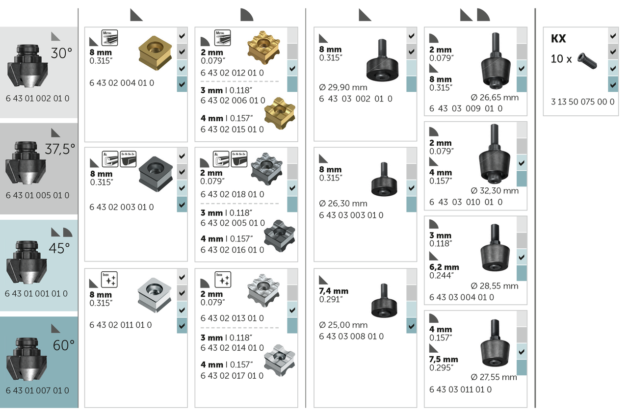- Çelik, paslanmaz çelik ve demir dışı metaller gibi çeşitli malzemeler için geniş aksesuar yelpazesi.